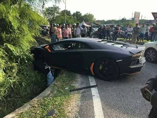 Матовый черный Lamborghini Aventador с оранжевыми акцентами сильно пострадал после аварии в Малайзии.