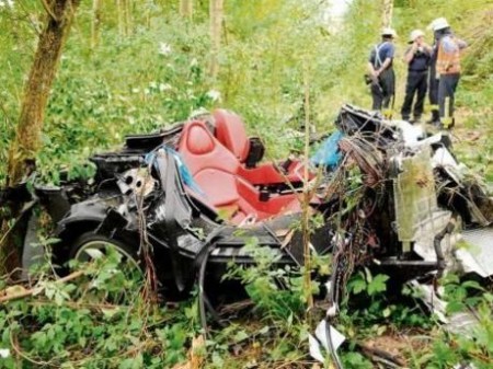 Согласно уже полицейскому отчёту, пилоты достигли скорости в 297 км/ч, когда их подбросило на высоту около 10 метров, после чего их автомобиль угодил прямиком в дерево, отлетев от него на 35 метров вниз по крутому склону. Обоих водителей выбросило из автомобиля. Оба погибли мгновенно.